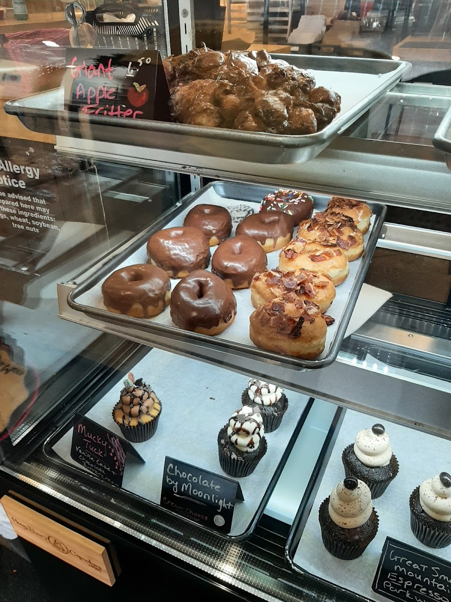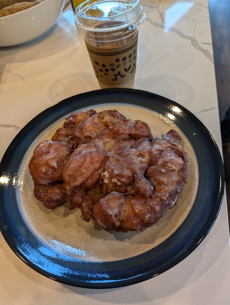 Let's talk apple fritters. We were waiting a table at Everett diner next door. We went next door to honey bear got some coffee and apple fritters. The fritter was gigantic, can easily feed 3. It's nice that the glaze isn't overwhelming, it's just right. The breading itself is not too sweet, the apples were caramelized before it was fried. It was not slapped together like some I've had. It was purposefully made. It was not overly sweet, good chewy texture, with a hint of sweetness, it was heavenly. The coffee is excellent, it's nice that it's from a local roaster. The coffee is fresh, not some watered down swill. I will be back next time I'm in town