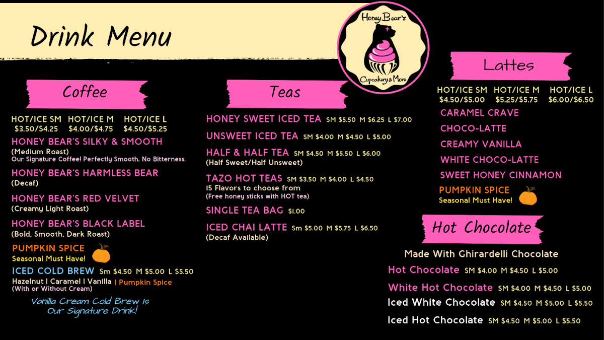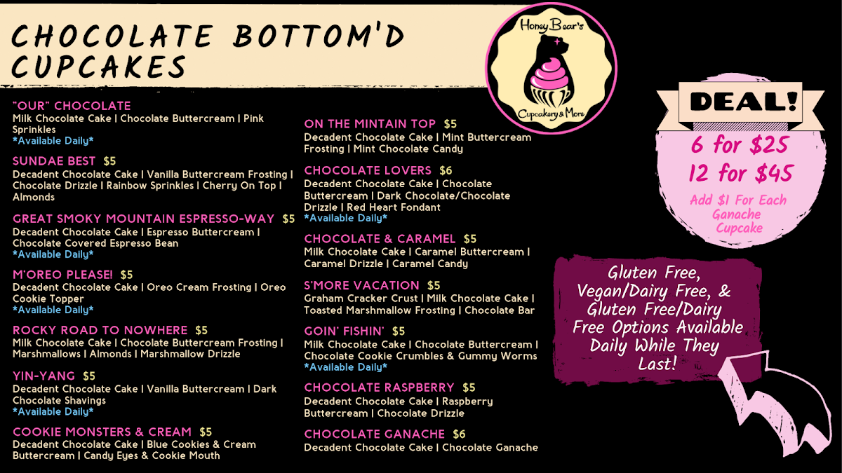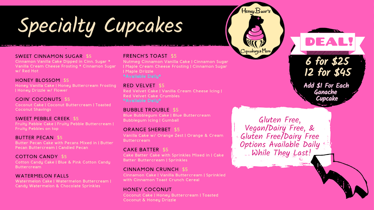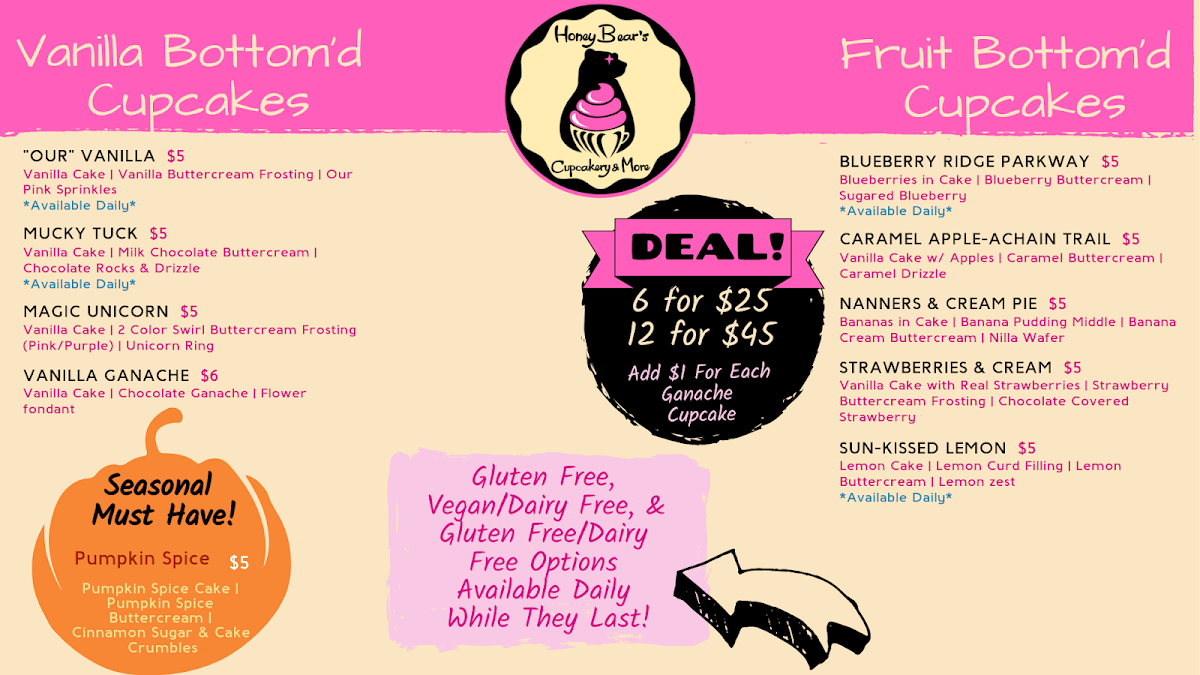 Welcome to Honey Bear's Cupcakery & More, a delightful gem nestled in Bryson City, NC. This charming cafe specializes in an array of mouth-watering treats that elevate any sweet tooth's dreams. Start your visit with their freshly baked donuts—choose from classic glazed or indulge in filled varieties like raspberry or Boston cream, all at just $2. For those seeking something more substantial, their big cinnamon roll at $6 offers a comforting, buttery delight.